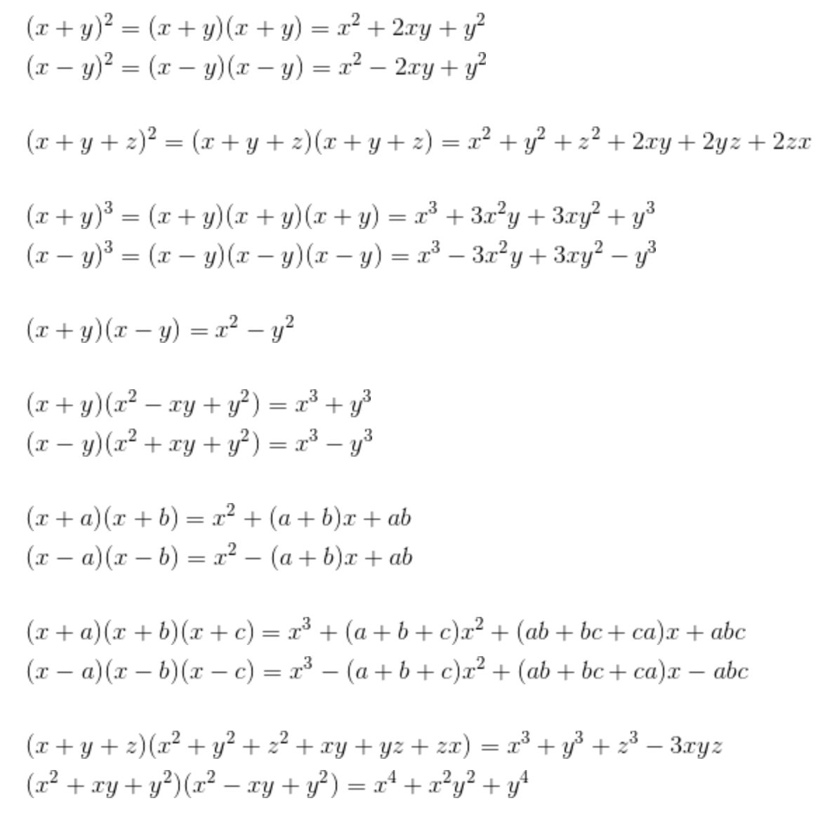 | 다항식 X, Y, Z에서 XY=YX는 (곱셈에 관한) 교환 법칙이라 하고 (XY) Z=X(YZ)는 (곱셈에 관한) 결합 법칙이라 하며, X(Y+Z)=XY+XZ, (X+Y) Z=XZ+YZ (곱셈에 관한) 분배 법칙이라고 한다. |