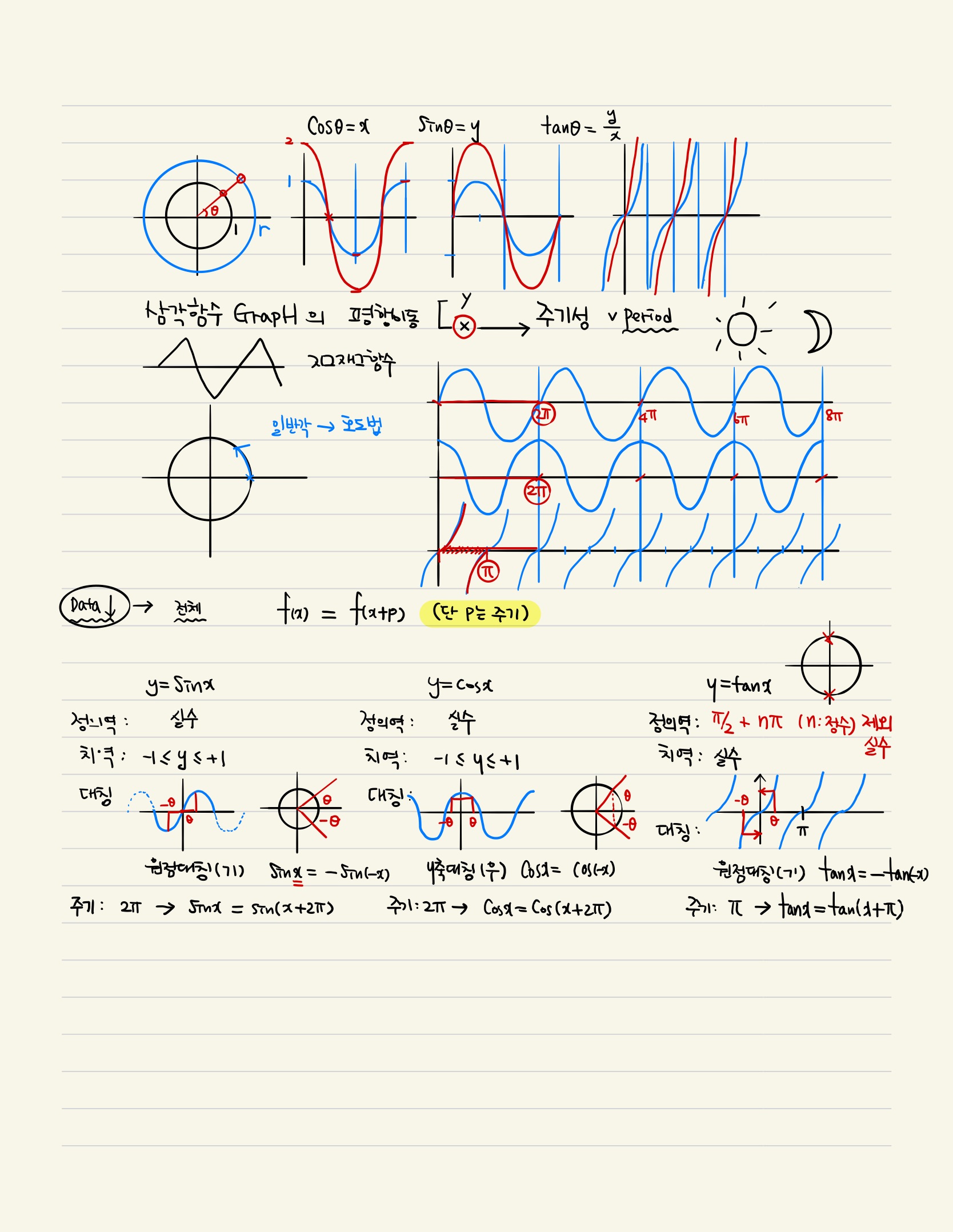 삼각함수의 실수배, 삼각함수의 대칭성, 삼각함수의 주기성에 대해서 살펴봤습니다.