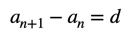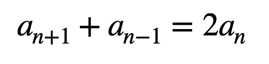 그렇지만 우리가 배운 임의의 연달아 나열되어 있는 세개의 항을 가져올 때마다 등차중항을 만족하는 규칙을 설명해도 괜찮습니다. 즉 다음과 같이 등차수열의 귀납적 정의는 세 개의 항이 있을 때, 가운데 항은 양 끝의 항의 합의 2배가 된다를 규칙으로 적으면 다음과 같습니다.