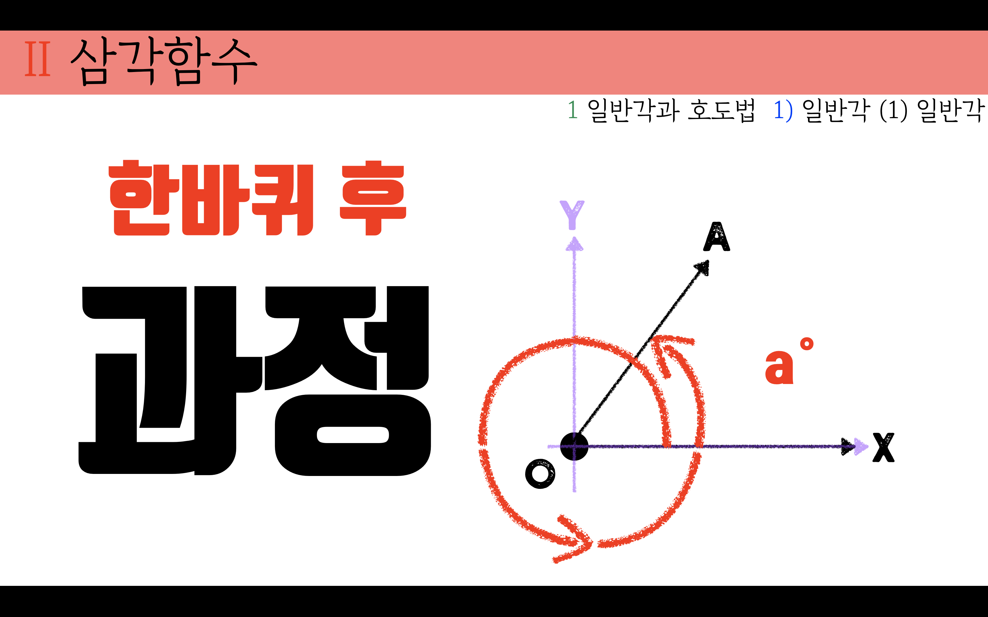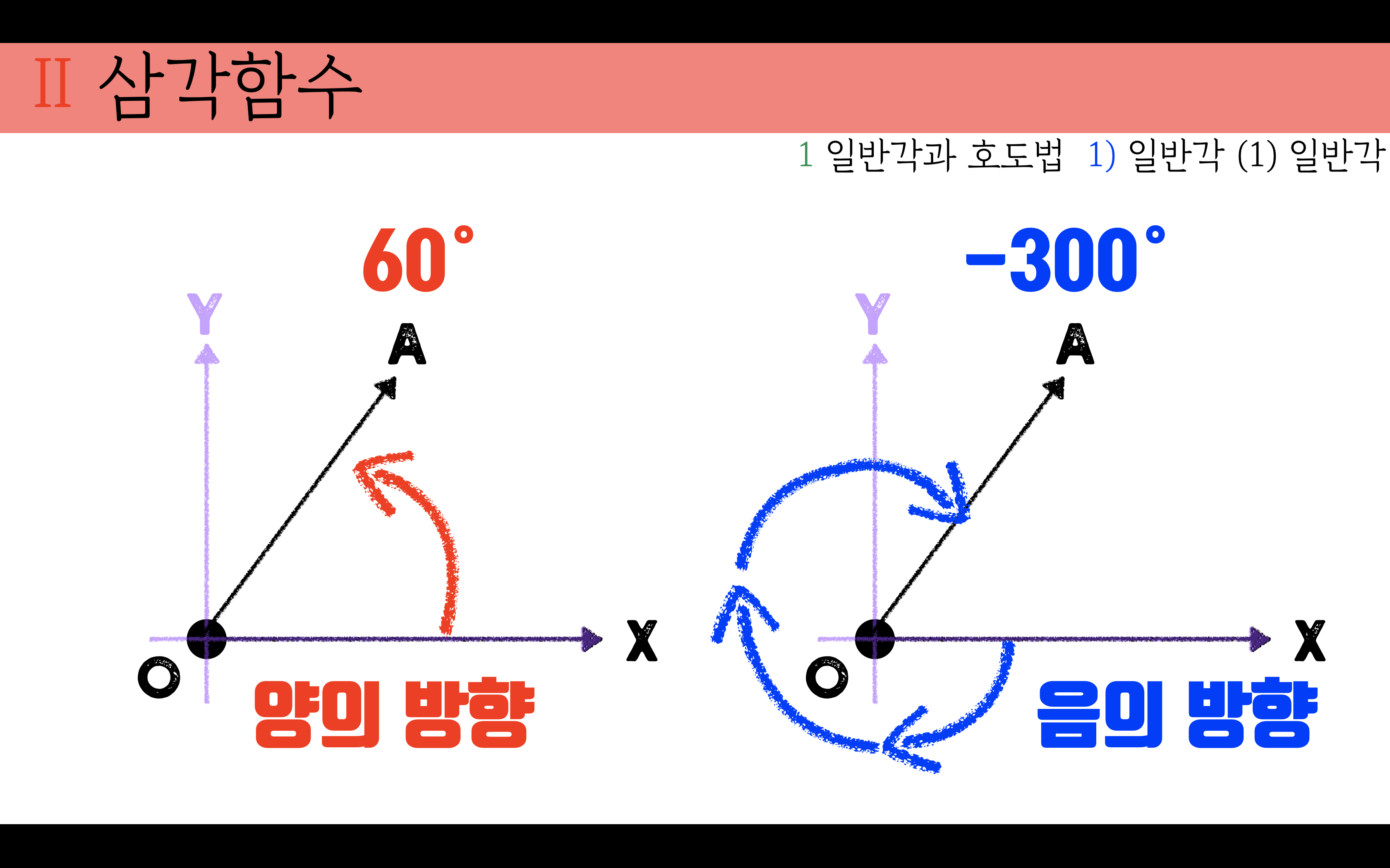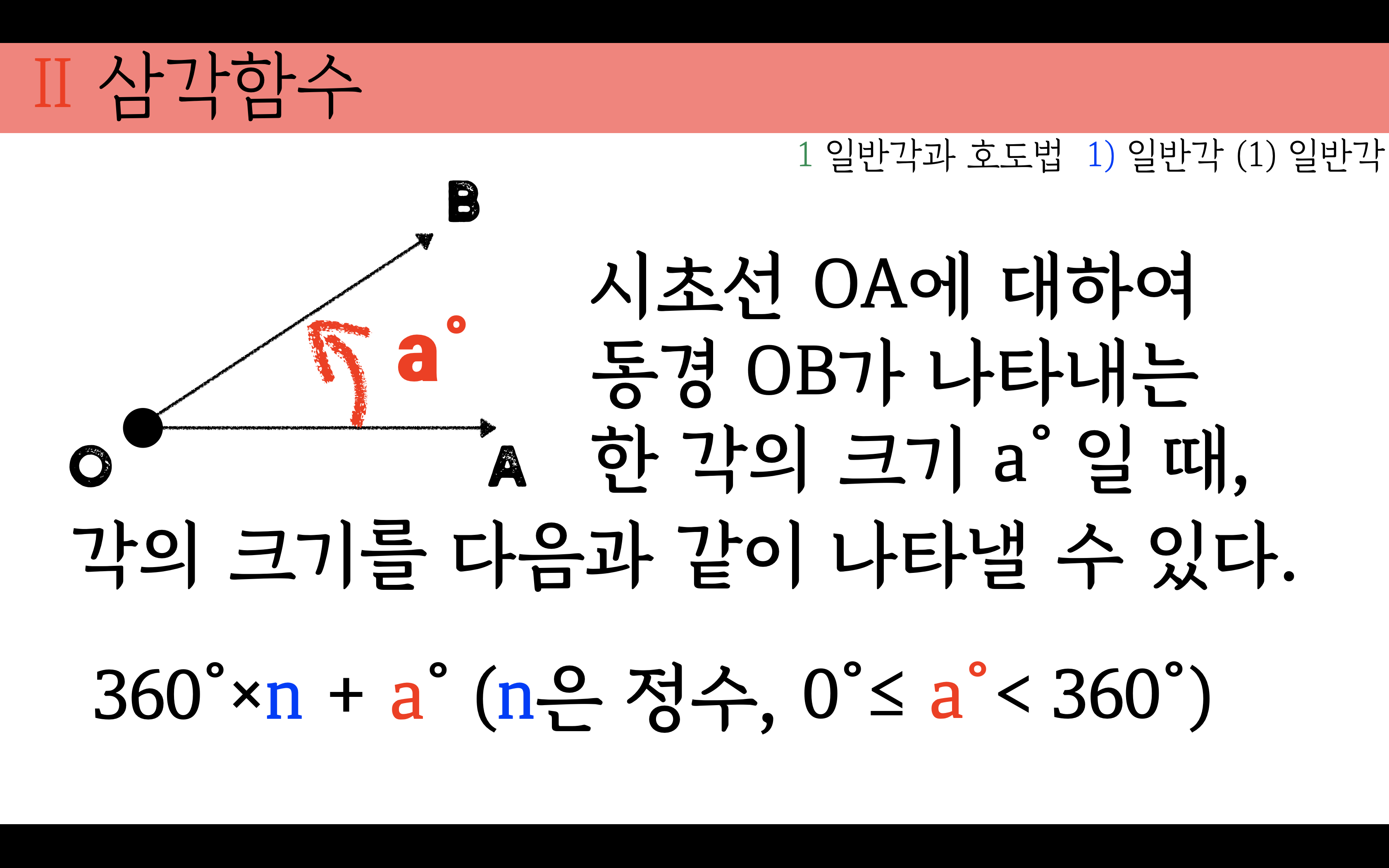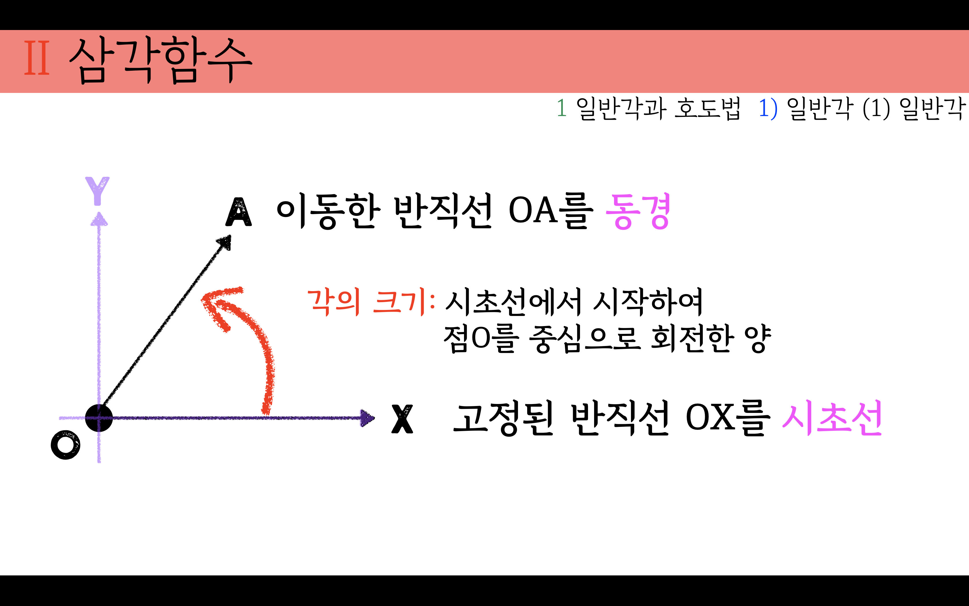 시초선, 각의 크기, 동경을 사용하여 일반각의 정의를 알아보자.