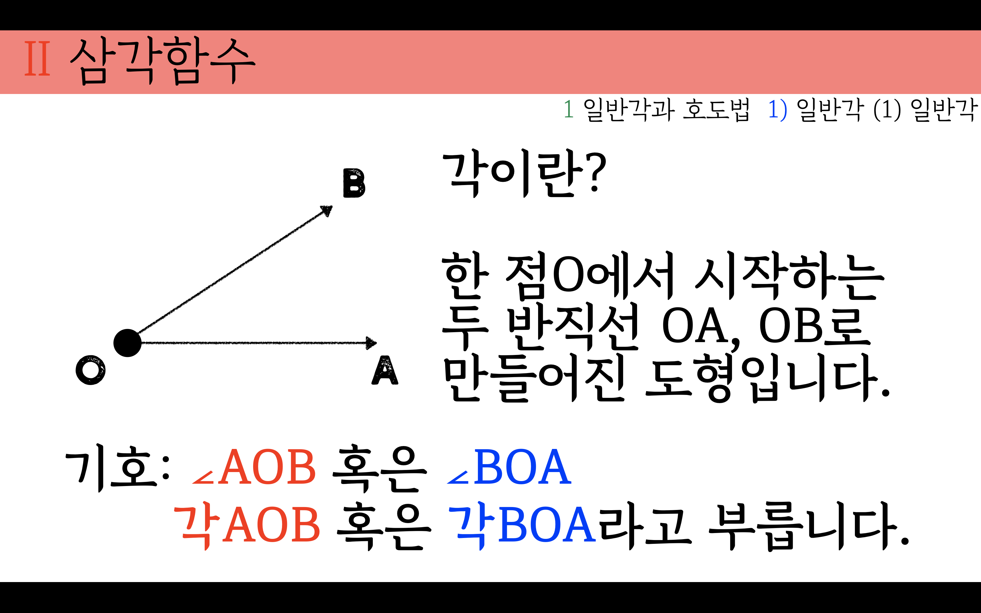 이 크기를 가진 각이라는 도형을 일반각이라고 한다.