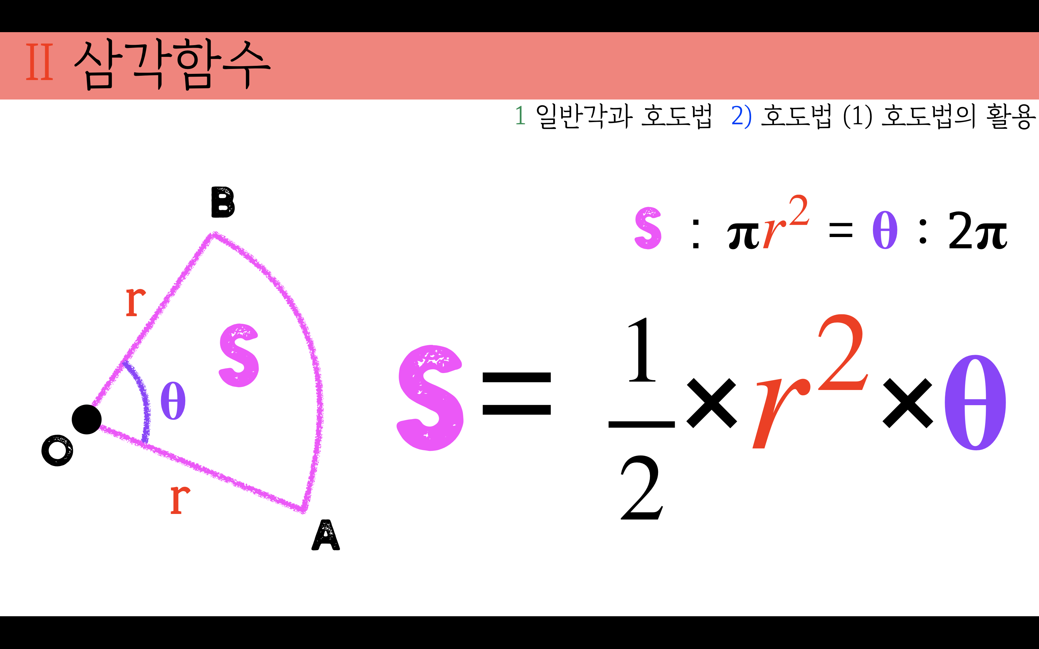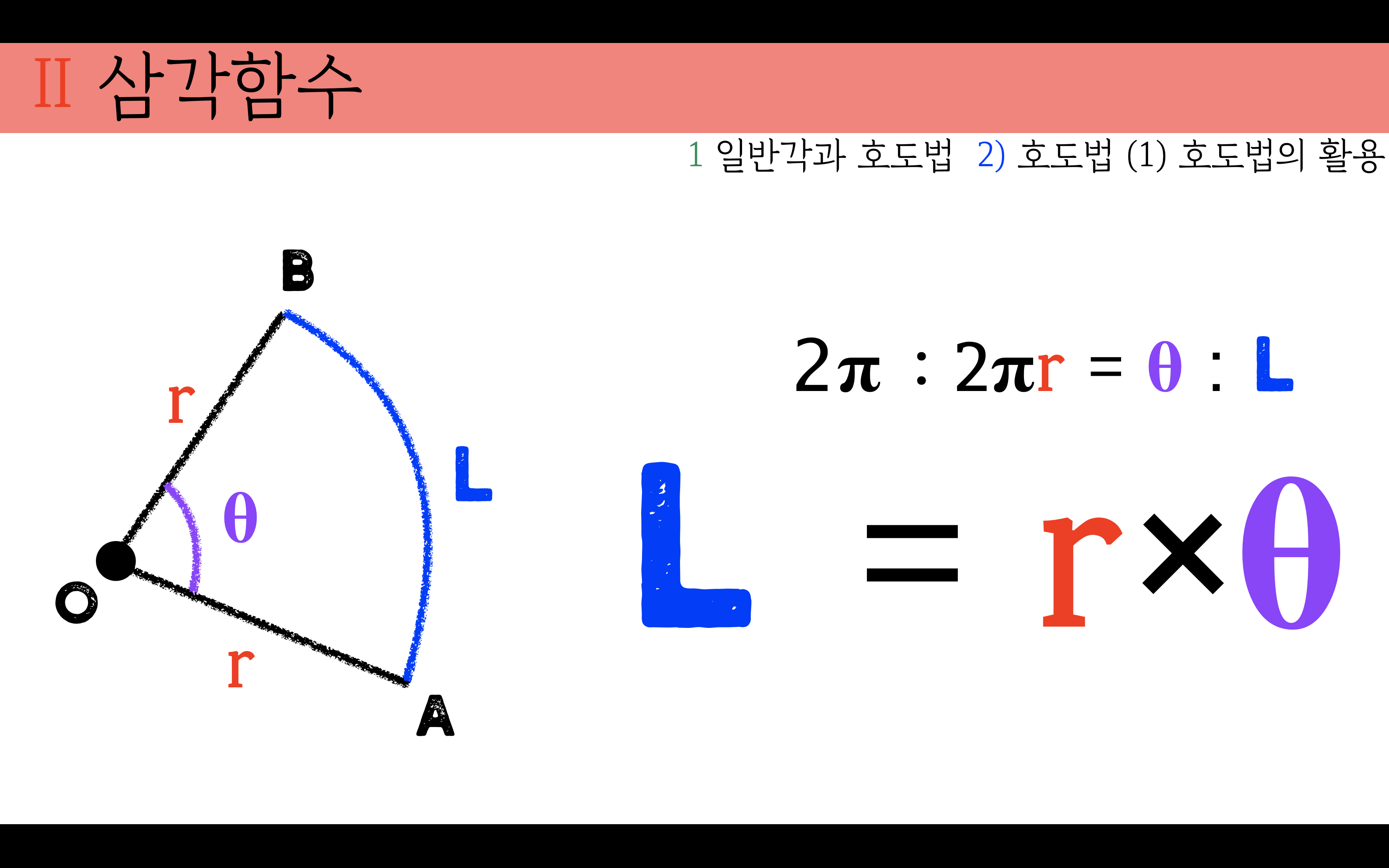 호의 길이는 반지름과 중심각의 곱이므로 식으로 정리하면 다음과 같다.