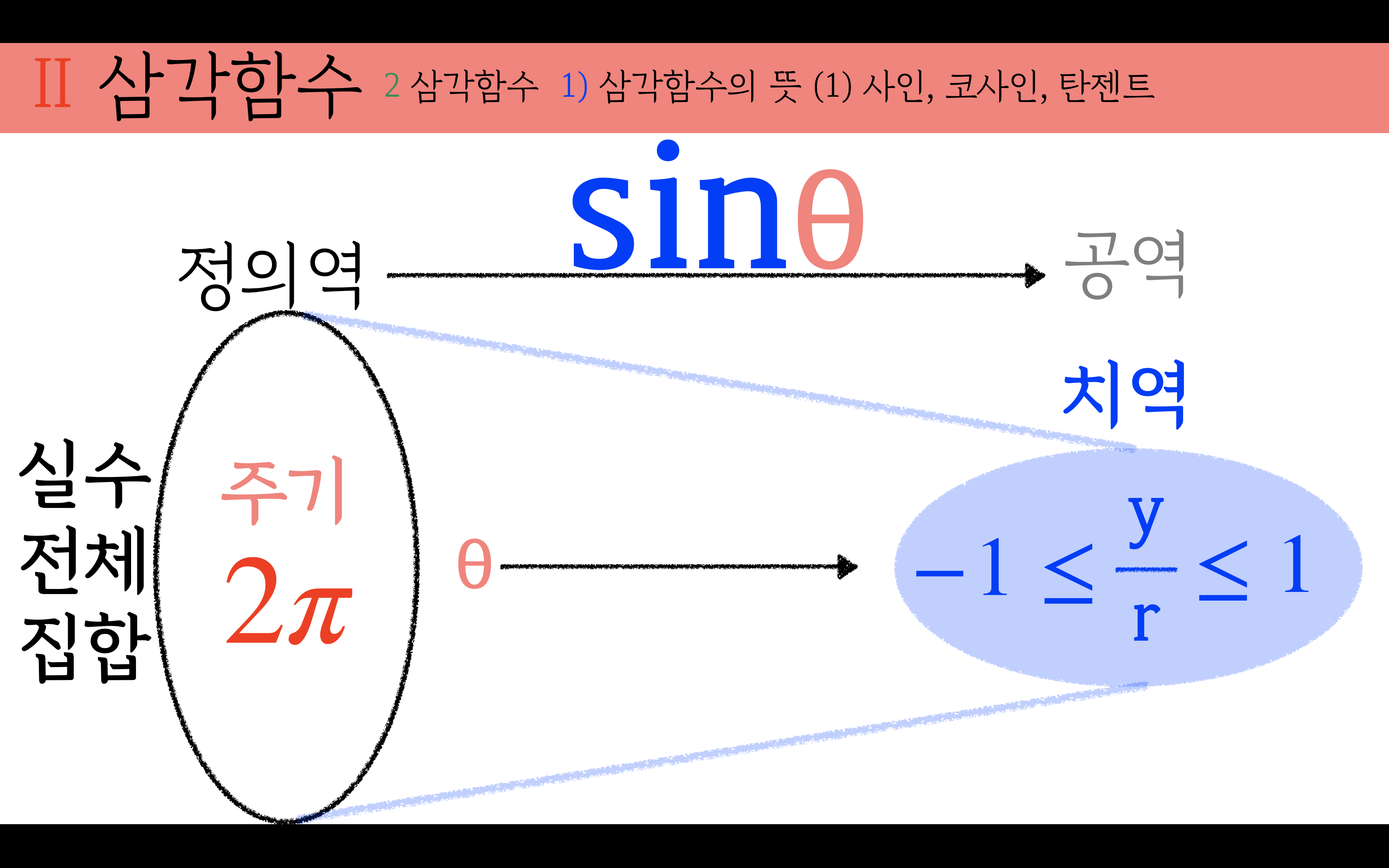 주기는 2𝜋를 갖는 사인함수의 정의역은 실수전체집합, 치역은 -1이상 +1이하 입니다.